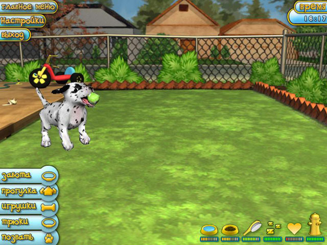 Вы можете выбрать пол, породу, окрас шерсти и возраст собаки (от 2,5 до 4 месяцев) из 6 предложенных вариантов. Придумайте щенку забавное имя и станьте его хозяином. Научитесь правильно ухаживать за ним — кормить, поить, расчесывать шерстку, мыть, водить на прогулку и обучать новым трюкам. Помните, что ваш щенок — живое существо, поэтому если вы будете плохо заботиться о нем, он может обидеться и стать непослушным.