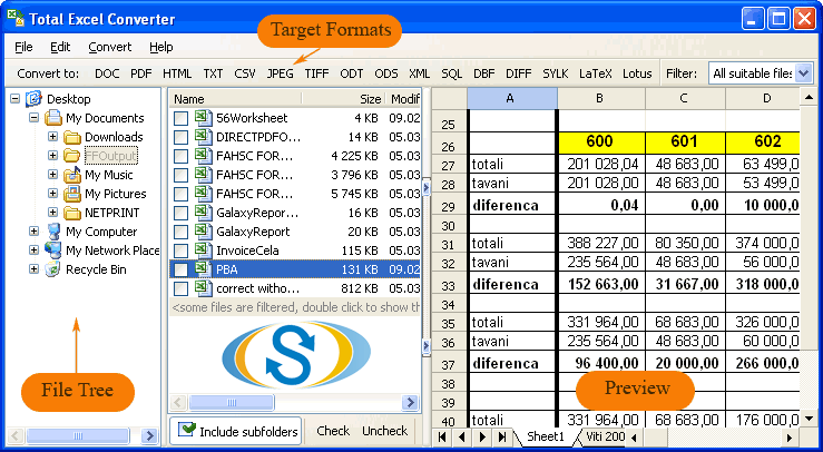 Total Excel Converter конвертирует практически любые таблицы. Помимо широко распространенного формата таблиц Excel, поддерживаются и таблицы OpenOffice (ODT и ODS), а так же .xml, .sql, .wk2, .dbf, .tex, .dif, .slk файлы. Помощник программы поможет сделать все необходимые настройки и подскажет новичкам лучшие варианты. Удобно просматривать файлы для конвертации встроенным просмоторщиком таблиц. Total Excel Converter имеет понятный пошаговый интерфейс и может работать с командной строки. Скачайте бесплатную версию сейчас и убедитесь сами. Полное описание »
