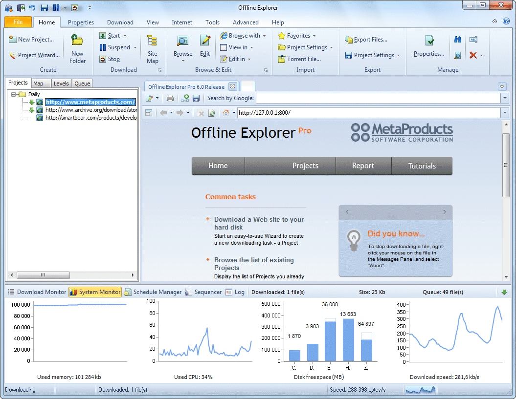 Посмотреть скриншот Offline Explorer ProOffline Explorer Pro предназначен для быстрой и качественной загрузки Web-сайтов, защищенных серверов (HTTPS), файлов на FTP серверах, а также потокового мультимедиа MMS и RTSP (MS Media Player и RealPlayer). Загрузку сайтов можно регулировать используя многочисленные настройки проектов, разрешать или запрещать адреса с помощью ключевых слов, ограничивать длительность загрузки по времени, по размеру информации или количеству файлов. Полностью поддерживается загрузка защищенных паролем сайтов. Мы добавили новые возможности для вычисления сложных выражений в Java-скриптах, что позволяет более точно загружать современные сайты. До этого было невозможно автоматически загружать ссылки, составленные из нескольких частей внутри скриптов. Уникальная возможность замены адресов по указываемым правилам позволяет избавляться от загрузки зеркал сайтов, закачивать страницы, предназначенные только для печати, ускорять загрузку сайтов с картинками.