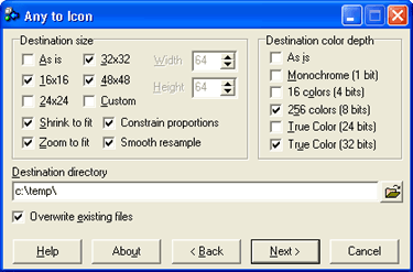 Any to Icon преобразует BMP, JPEG, GIF, PNG, PSD, WMF, WBMP, PCX, TIFF, XPM, XBM и CUR форматы в иконки Windows. Вы можете добавлять файлы и каталоги из Проводника или другой файловой оболочки методом перетаскивания. Вы также можете вставлять изображения из буфера обмена и настраивать глубину цвета и размеры создаваемых иконок. Возможно конвертировать 256-цветные иконки в True Color иконки и наоборот.