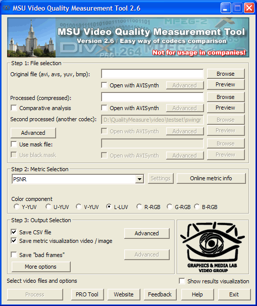 Free program for video quality measurements. Program main features include: 1. Support of 15 objective metrics and 5 plugins. Among them: PSNR, MSAD, SSIM, VQM and etc. 2. Support of more than 30 video formats, including those with 10-, 14- and 16-bit color depth. Supported formats include AVI, YUV (YUV, YV12, UYVY, etc.), BMP, MOV, VOB, WMV and others. 3. Metric Visualization. Program can generate visualization video for each specified metric. This video contains the visual information about metric values in each pixel of the frame. Visualization video allows easily judge about video quality nature. 4. Multi-Core Processors Support. The program intensively utilizes MMX, SSE and OpenMP optimizations. 5. Comparative Analysis. VQMT is able to compare 3 files at time. 6. ROI Support. Metric calculation is possible for specified region of the frame (Region of Interest, ROI). 7. GUI and Batch Processing. VQMT consists of GUI and command line tools. 8. Plugins Interface. You can easily develop your video quality metric via plugin mechanism. 9. Universal Format of Results. Results are stored in *.CSV format. 10. HDTV Support. Professional version of VQMT supports HD resolution. 11. Open-Source Plugins. Open-source plugins are available, it can be used as a starting point for custom video metric. Полное описание »