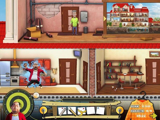 Ходите по комнатам и смотрите, где и как можно напакостить. Вот в углу стоят коробки с надписью "Осторожно, стекло!" — ударьте по ним молотком, да посильнее! А тут лежит замечательный половичок — приклейте его к полу, толстяк наверняка об него запнется. Заодно пролейте воду в коридоре, чтобы проверить, как у вашего соседа с пластикой и координацией движений.