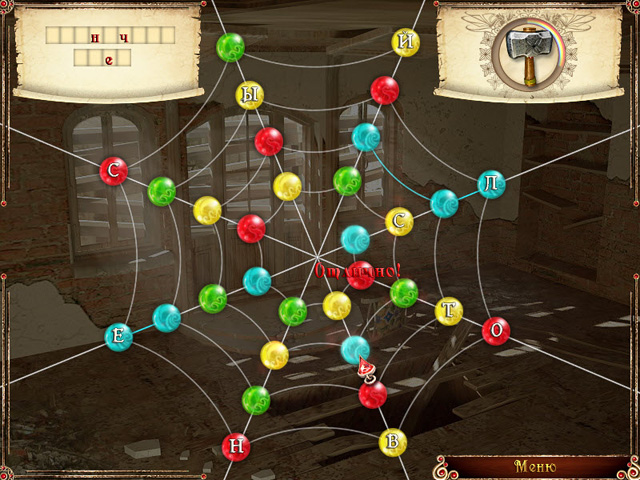 Шарики разбросаны на паутине, и на каждом уровне ее рисунок меняется. Проявите внимательность и смекалку, а если замешкаетесь, воспользуйтесь подсказкой. Составляя линии из фигурок, вы не только накапливаете радужные краски, но и освобождаете из паутины волшебные слова. Они помогут вам рассеять злые чары, окутавшие сказочный городок. Каждая буква — на отдельном шарике, затерянном среди других фишек. Найдите все буквы, и уровень успешно завершится.