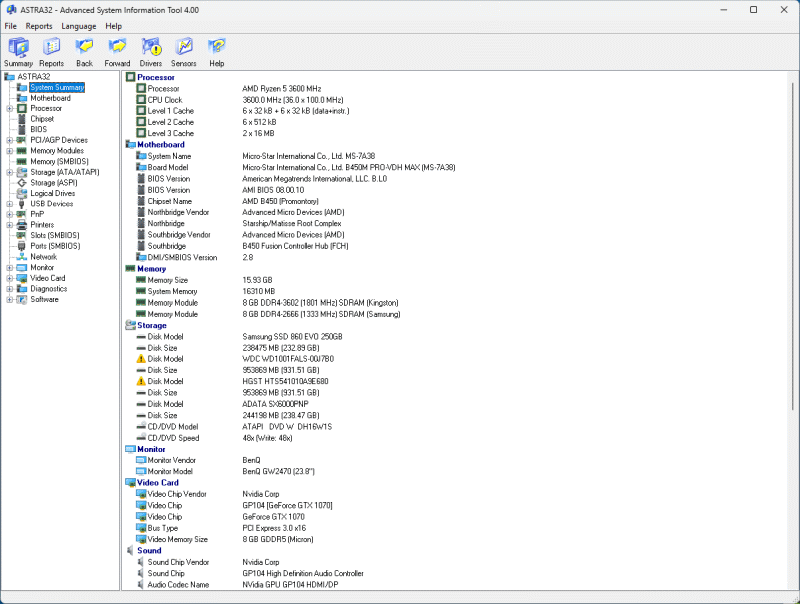 Посмотреть скриншот ASTRA32 - Advanced System Information ToolПрограмма определения конфигурации и диагностики компьютера. Позволяет получить подробную информацию (в том числе недокументированную) об аппаратном обеспечении компьютера и режимах его работы. Содержит уникальную функцию поиска устройств с неустановленными драйверами и функцию быстрой проверки надежности винчестеров. Позволяет получить сведения о процессоре, материнской плате, жестких дисках, S.M.A.R.T., CD/DVD, SCSI устройствах, модулях памяти, чипсете, BIOS, PCI/AGP, USB и ISA/PnP устройствах, мониторе, видеокарте, звуковой и сетевой карте, принтере, установленных программах и обновлениях и многом другом. Создание файла-отчета в текстовом, INI, HTML и XML форматах, возможность экспорта данных в программы учета вычислительной техники. Возможность работы в режиме командной строки.